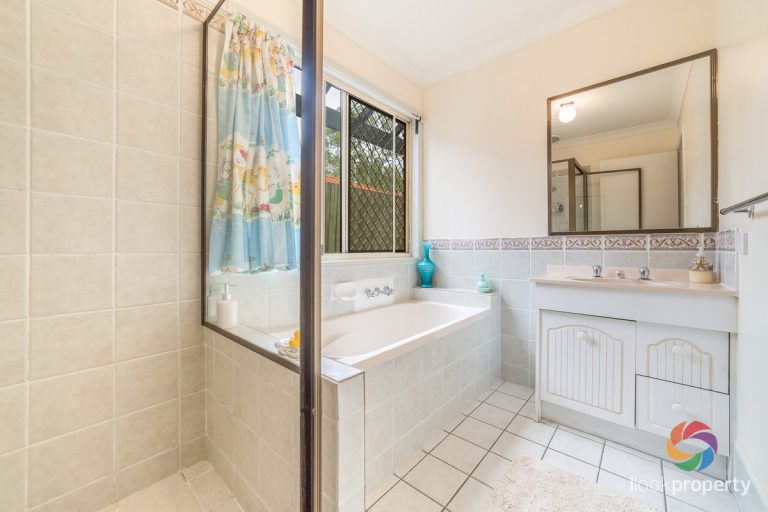 - Main bathroom features a bath and separate shower